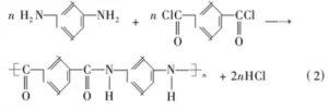 PMIA is synthesized by the low-temperature polycondensation of isophthaloyl chloride and m-phenylenediamine. Meta-aramid can be produced by dry spinning, wet spinning, or dry-jet-wet spinning. The reaction equation for PMIA is shown below.