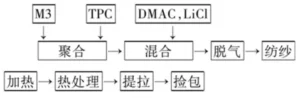 Aramid III resin is a ternary copolymer obtained by introducing a third unit (M3) into the polycondensation reaction, partially replacing PPDA and TPC in the polycondensation reaction in a low-temperature solution. In this polymerization reaction, a strong polar solvent N, N-dimethylacetamide (DMAC) and a co-solvent lithium oxide (LiCl) need to be added. The production process flow is shown in the figure below.
